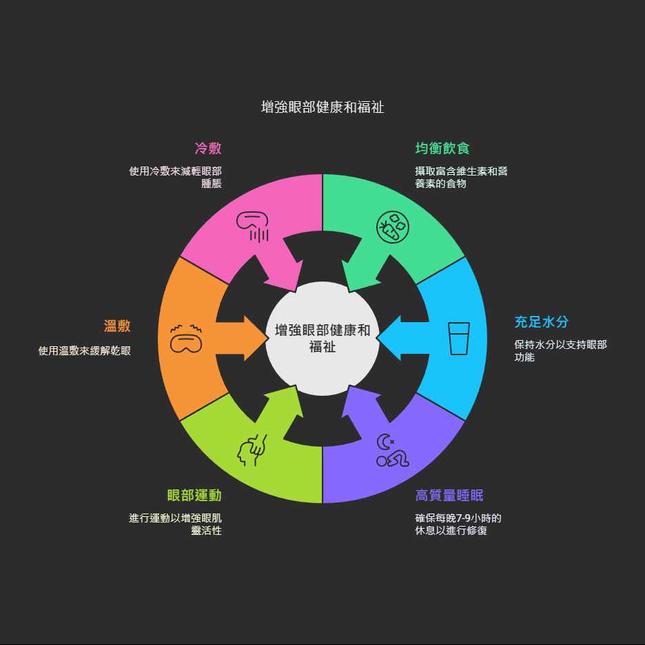眼周按摩是核心,但輔助策略能讓效果加乘,全面助力您的「樂健生活」。均衡飲食,攝取富含維他命A、C、E、葉黃素、玉米黃素及Omega-3的食物,如深綠色蔬菜、胡蘿蔔、堅果,為眼睛提供必需的營養。充足的飲水和每晚7-9小時的高質量睡眠,是眼部修復與再生的黃金時間。此外,簡單的眼部運動如「掌敷法」(搓熱掌心敷眼)、「有意識眨眼」和「遠近調焦法」,都能增強眼肌靈活性,緩解僵硬感。溫敷能改善乾眼,冷敷則有助於減輕眼部腫脹。
