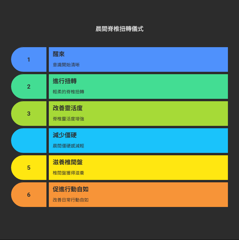 將晨間脊椎扭轉融入生活,可以從每天一兩分鐘開始,將它與您既有的晨間習慣(如關掉鬧鐘後)連結起來。專注於練習後身體的舒暢感,這種正向回饋會成為您堅持下去的動力。您也可以將它與其他溫和的晨間練習,如深呼吸、冥想或飲用一杯溫水相結合,打造專屬於您的「樂健晨間儀式」。記住,「樂健生活」並非遙不可及的目標,它始於我們對自己身體的每一次溫柔呵護與細心聆聽。