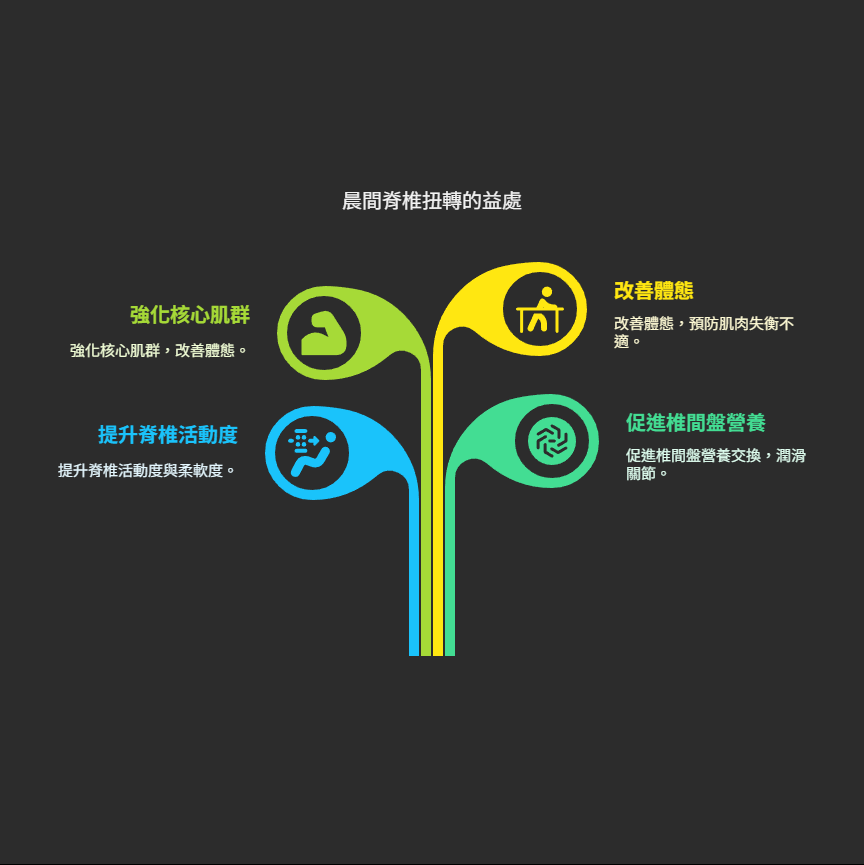 談到生理益處,晨間輕柔的脊椎扭轉,如同一把鑰匙,能開啟身體多方面的正向循環。它不僅提升脊椎本身的活動度與柔軟度,更透過溫和的旋轉動作,促進椎間盤的營養交換,如同為關節上了一層潤滑油。同時,這個動作能均衡地伸展與強化支撐脊椎的核心肌群,如腹內外斜肌、腰方肌等,有助於改善體態,預防因肌肉失衡引發的代償性不適。這些肌群的健康,是維持脊柱穩定與功能正常的基石。