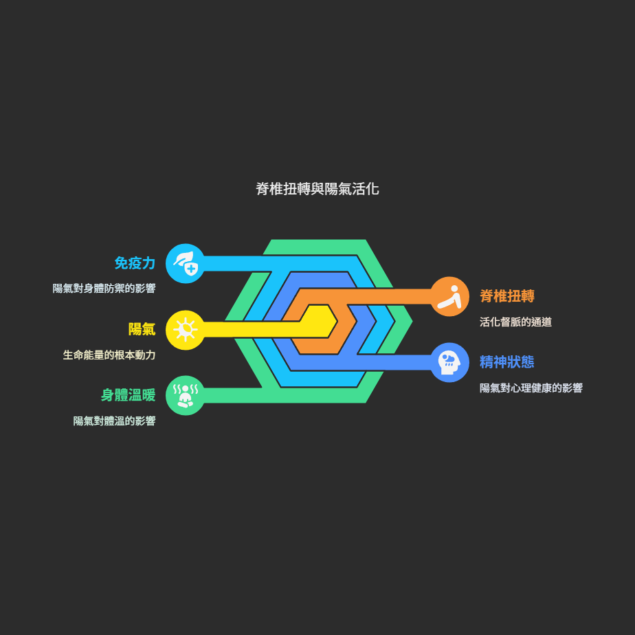 在傳統中醫的智慧中,脊椎是督脈循行的主要通道,督脈總管一身的陽氣。晨間進行脊椎扭轉,有助於疏通督脈氣血,振奮身體的陽氣。陽氣是人體生命活動的根本動力,它的充盈與否,直接關係到我們的精神狀態、免疫力及身體的溫煦程度。因此,晨起順應陽氣升發之時,透過扭轉來活絡脊柱,不僅能讓人感覺更有精神、身體更溫暖,也符合了中醫「順時養生」的理念,為「樂健生活」注入了傳統的生命力觀。
