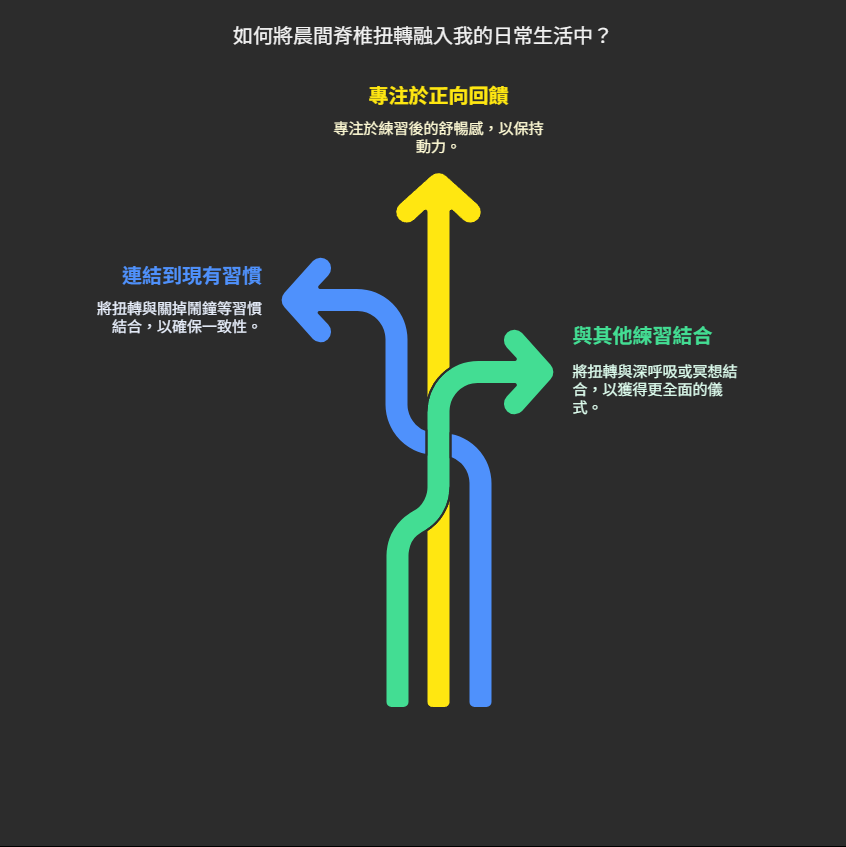 將晨間脊椎扭轉融入生活,可以從每天一兩分鐘開始,將它與您既有的晨間習慣(如關掉鬧鐘後)連結起來。專注於練習後身體的舒暢感,這種正向回饋會成為您堅持下去的動力。您也可以將它與其他溫和的晨間練習,如深呼吸、冥想或飲用一杯溫水相結合,打造專屬於您的「樂健晨間儀式」。記住,「樂健生活」並非遙不可及的目標,它始於我們對自己身體的每一次溫柔呵護與細心聆聽。
