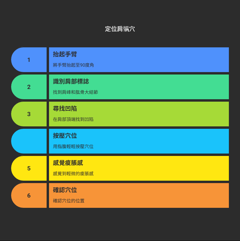那麼,這個神奇的肩髃穴究竟在哪裡呢?尋找肩髃穴其實很簡單。首先,您可以將一隻手臂向外側平舉,讓手臂與身體大約呈90度角。這時,在您肩部的最頂端,肩峰(即肩膀外側可摸到的一塊骨頭)與肱骨大結節(上臂骨上端的一個突起)之間,通常會出現前後兩個凹陷。肩髃穴就位於前方那個比較明顯的凹陷之中,也就是在三角肌上部的中央位置。用指腹輕輕按壓,如果您能感覺到輕微的痠脹感或一個小小的凹陷,那恭喜您,就找到它了!這個看似簡單的定位,其實已經為我們的肩部帶來了初步的舒緩。