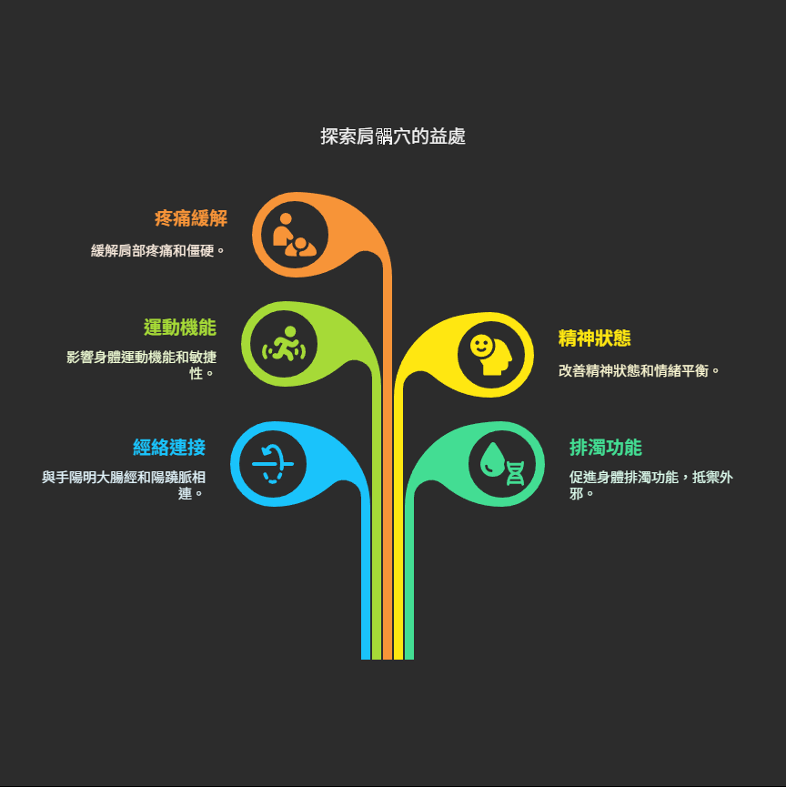 將肩髃穴的按摩融入日常生活,其實是為我們的「樂健生活」播下一顆健康的種子。想像一下,當肩部的疼痛得到緩解,活動自如了,我們的睡眠品質是不是會提高?我們是不是更能無憂無慮地投入到自己喜愛的運動和休閒活動中?長期的肩部不適很容易導致含胸駝背等不良體態,而肩部功能的恢復則有助於我們挺直腰背,展現更自信的姿態。更深一層來看,中醫認為肩部也承載著我們的壓力和情緒,按摩肩髃穴,不僅能鬆解肌肉的緊張,或許也能幫助我們釋放積壓的情緒,帶來心靈的輕鬆。