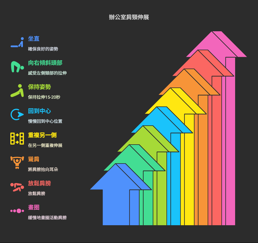 面對肩頸發出的「求救信號」,我們其實可以在辦公室進行簡單的「微伸展」來自我緩解。首先,請您坐直身體,感受脊柱向上自然延伸。接著,緩慢地將頭偏向右側,感受左邊頸部肌肉的輕微拉伸感,若想加強,可用右手輕扶頭部,但切記動作務必溫和,避免過度拉扯。保持這個姿勢約15至20秒,然後慢慢回到正中,換另一邊重複。完成兩側伸展後,可以進行聳肩動作,將肩膀盡量靠近耳朵,然後徹底放鬆落下。最後,以肩膀為圓心,向前、向後緩慢地畫圈,活動肩關節。這套簡單的組合動作,能有效促進局部血液循環,舒緩肌肉緊張,並提醒我們重新關注身體姿態。