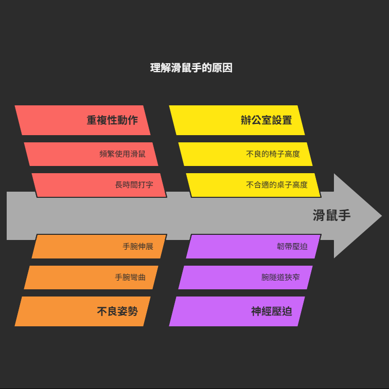要有效預防「滑鼠手」,我們首先需要理解它的成因。醫學上稱為腕隧道症候群,主要是因為手腕處的正中神經受到壓迫所致。腕隧道本身是一個由腕骨和韌帶構成的狹窄通道,正中神經與多條肌腱共同穿行其間。長時間打字、使用滑鼠等重複性動作,容易導致肌腱發炎腫脹,進而擠壓到神經。不良的辦公桌椅設置,迫使手腕處於不自然的彎曲或伸展姿態,更是雪上加霜。這些看似微不足道的因素,日積月累便會引發麻木、刺痛,甚至力量減弱等惱人症狀。