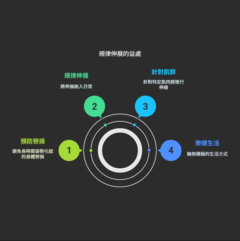 理解這兩種伸展分別針對不同但都極其重要的肌群,能幫助我們更主動地將其納入日常。建議每工作一小時,或在完成一項任務後,就進行這兩組伸展。將這些「樂健生活」的微小行動融入工作節奏中,持之以恆,遠比一次性的高強度運動來得更有益。記住,預防的關鍵在於規律與溫和,讓身體在不知不覺中得到呵護,遠離因長時間固定姿勢帶來的勞損。