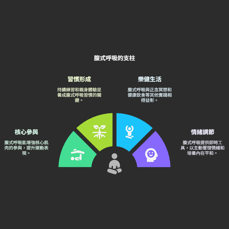 運動時,尤其在瑜伽、太極等練習中,配合腹式呼吸能提升核心參與和運動表現。初期可設定提醒或放置小紙條,重要的是持續練習,並體會它帶來的正面改變,如更安穩的睡眠或更平靜的情緒。這些親身體驗是鞏固習慣的最佳動力,讓呼吸成為您生活中的自然部分。腹式呼吸與其他「樂健生活」實踐相得益彰,例如正念冥想、健康飲食或親近自然。養成腹式呼吸的習慣,如同播下「關鍵習慣」的種子,能引發一連串正向的生活轉變。它賦予我們即時可用的情緒調節工具,從被動應對壓力轉為主動管理情緒,培養內在平和。