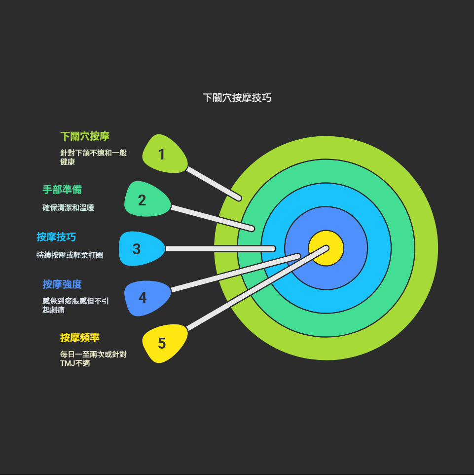 除了專業的按摩調理,學會自我按摩下關穴,更能將這份健康益處延伸至日常。首先,確保雙手清潔溫暖。然後,用您的食指或中指指腹,輕柔地按壓在閉口時顴弓下方的凹陷處——下關穴。您可以採用持續按壓(每次3-5秒,稍作休息再重複)或輕柔打圈的方式(揉法)。力度以感覺到「痠脹感」但不引起劇痛為宜。一般保健可每日一至兩次,每次按摩1-2分鐘。若針對TMJ不適,可嘗試每次按壓1分鐘,重複三次,感受下頜的變化。