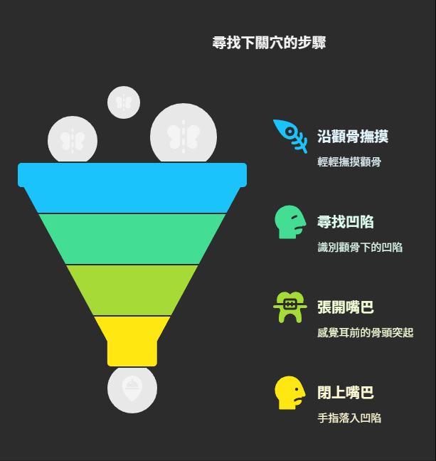 要體驗下關穴的益處,精準定位是第一步。您可以嘗試這個方法:面對鏡子,用手指從耳朵正前方沿著顴骨(蘋果肌的骨頭)邊緣往下輕輕撫摸,當您閉上嘴巴時,會在顴骨下緣摸到一個最明顯的凹陷,這就是下關穴了。另一個技巧是:先張開嘴巴,您會感覺到耳前有一個骨頭突起(下頜骨的髁狀突),將手指放在這個隆起上,然後慢慢閉上嘴巴,手指便會自然落入一個凹陷中,這就是下關穴。記住,「閉口取穴」是關鍵,因為這樣才能讓穴位處於最適合接受調理的狀態。