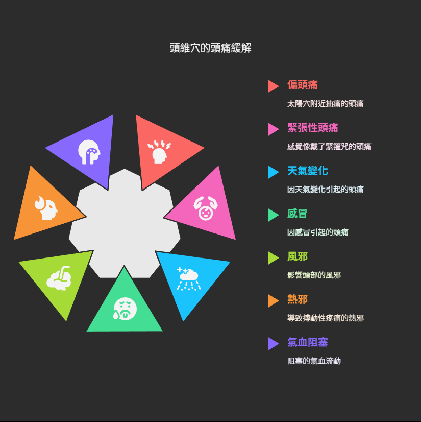 頭痛是許多朋友的共同困擾,而頭維穴正是對抗頭痛的得力助手。無論是太陽穴附近抽痛的偏頭痛,還是像戴了緊箍咒般的緊張性頭痛,甚至是因為天氣變化、感冒引起的頭痛,按摩頭維穴都能發揮其「祛風止痛」的功效。它能幫助驅散影響頭部的「風邪」,同時清瀉可能導致搏動性疼痛的「熱邪」,並且透過「通絡活血」的作用,疏通阻塞的氣血,從根本上緩解疼痛,讓您的頭部恢復輕鬆自在的感覺。