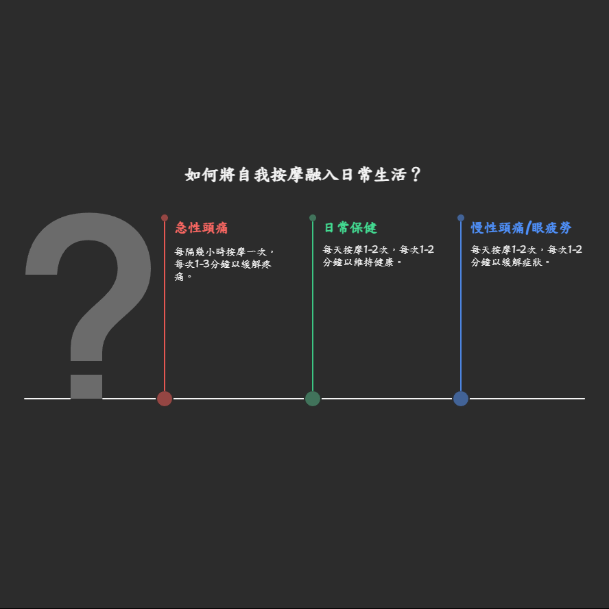 自我按摩貴在堅持。如果您正經歷急性頭痛,可以每隔幾小時按摩一次,每次1至3分鐘。若作為日常保健,或是緩解慢性頭痛與眼疲勞,建議每天進行1至2次,每次按摩1至2分鐘即可。將按摩頭維穴融入您的日常生活,例如在工作空檔、睡前或是感到疲勞時進行。規律的按摩,才能讓頭維穴持續發揮其調理作用,成為您維護頭部長久健康與舒適的忠實夥伴,讓您真正享受「樂健生活」。