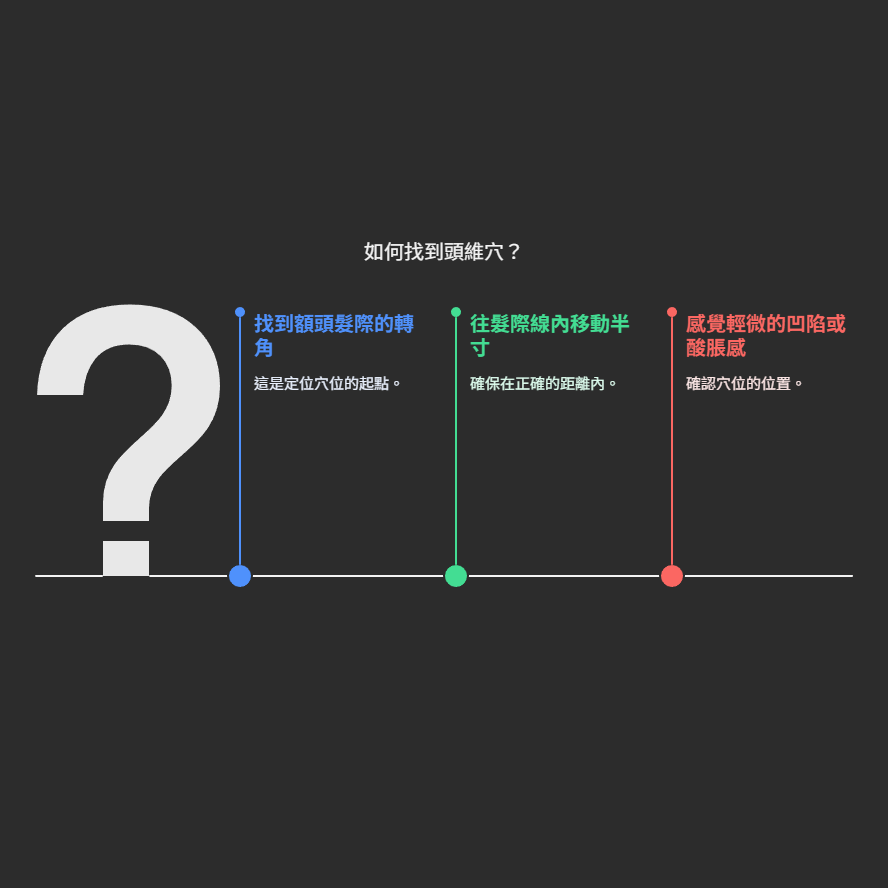 找到頭維穴其實一點也不難。請您先找到額頭髮際的轉角處,接著往髮際線內移動大約半寸,也就是您大拇指指甲的寬度。這個位置距離我們頭部正中央線大約4.5寸。通常,您會在那裡感覺到一個輕微的凹陷,或者當您用指腹按壓時,會傳來一股微微的酸脹感——這就是頭維穴了!建議您可以對著鏡子,用指腹輕輕地探索,多嘗試幾次,很快就能熟練地找到這個屬於您的健康按鈕。