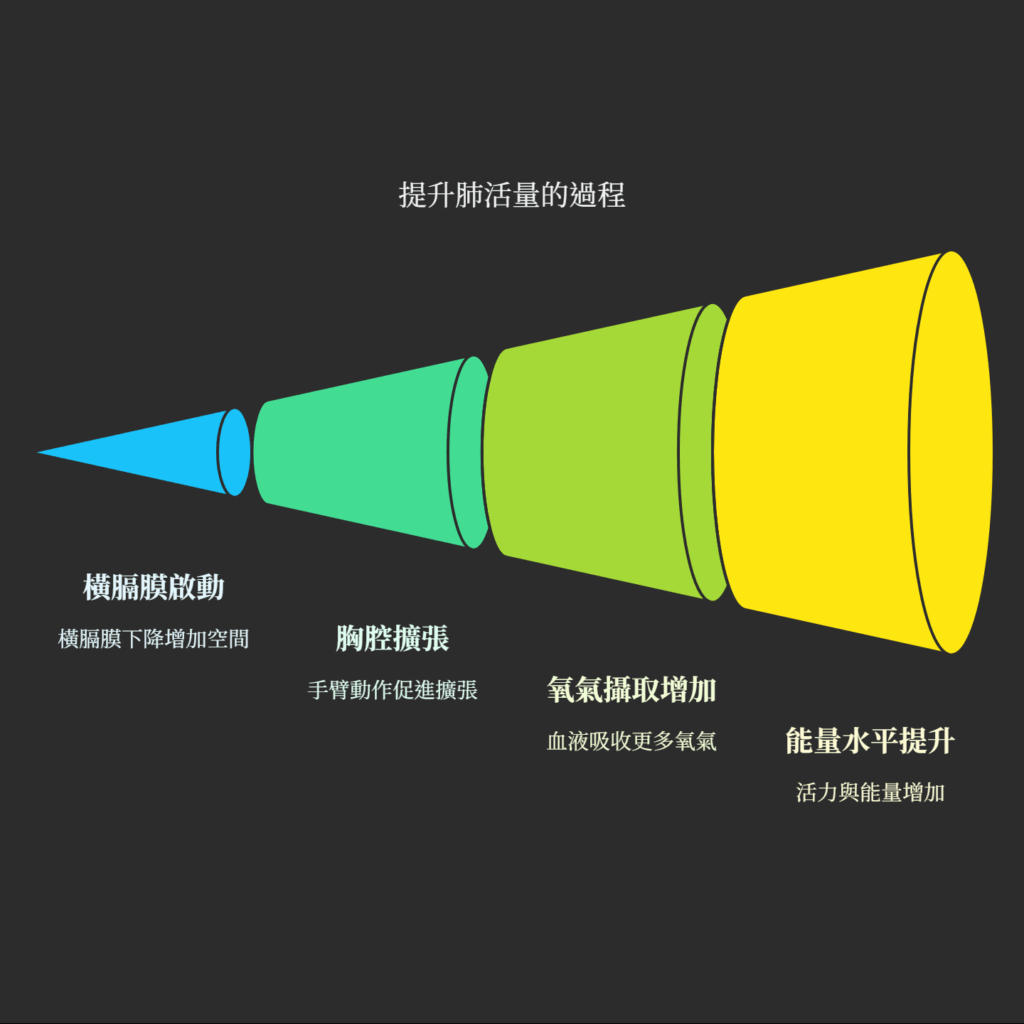 「深呼吸擴胸」如何提升肺活量?關鍵在於啟動了我們的主要呼吸肌——橫膈膜。當我們深吸氣,橫膈膜下降,增加胸腔空間,讓空氣自然吸入。這個運動正是重新訓練橫膈膜的有效方式。同時,手臂打開的動作,促進了胸廓橫向擴張,讓肋間肌更有效地工作。這不僅增加了肺部能吸入的空氣量,也意味著血液能獲得更充足的氧氣,帶來更充沛的精力與活力。規律練習,呼吸將變得更有效率,減少能量消耗。