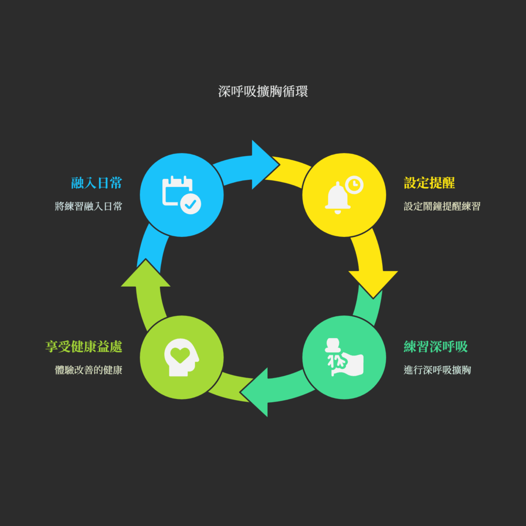 除了工作間歇,您也可以將「深呼吸擴胸」融入一天的開始與結束。清晨練習,能喚醒身體,舒展胸廓,為新的一天注入活力。夜晚睡前練習,則有助於釋放累積的壓力與緊張,引導身心進入平靜,為高質量睡眠做準備。找到最適合您的節奏,並將其培養成習慣。規律的練習,無論何時進行,都將為您的「樂健生活」奠定堅實的基礎,讓健康成為一種自然而然的狀態。