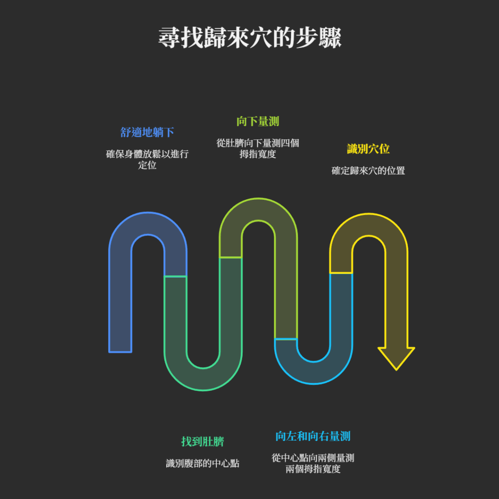 要體驗歸來穴的力量,第一步便是精確地找到它。請您舒適地躺下,讓腹部肌肉完全放鬆。首先,找到您的肚臍。從肚臍中心垂直向下量測約四個您自己拇指併攏的寬度(這大約是4寸)。接著,從這個點向左和向右各量測約兩個您自己拇指併攏的寬度(這大約是2寸)。這兩個點,就是我們今天的主角——歸來穴(ST29)。記住,尋找穴位是一種探索,保持耐心與溫柔,您的身體會引導您。