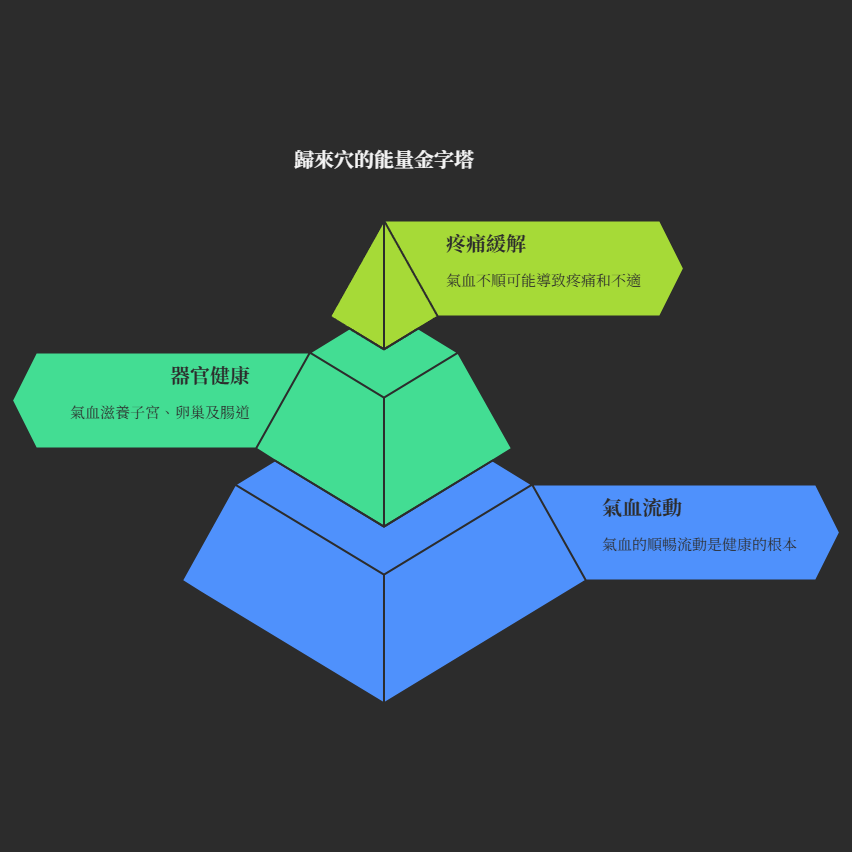 這個穴位的名字「歸來」,蘊含著深遠的意義。它象徵著讓偏離軌道的生理功能「歸」於正常,讓失衡的能量「來」到平衡。在中醫的觀點裡,它就像一位溫柔的引導者,幫助紊亂的月經週期重回規律,協助移位的組織結構復位,甚至承載著迎接新生命「歸來」的美好期盼。每一次觸碰這個點,都像是在提醒我們的身體,是時候回到那最舒適、最健康的原始狀態了。