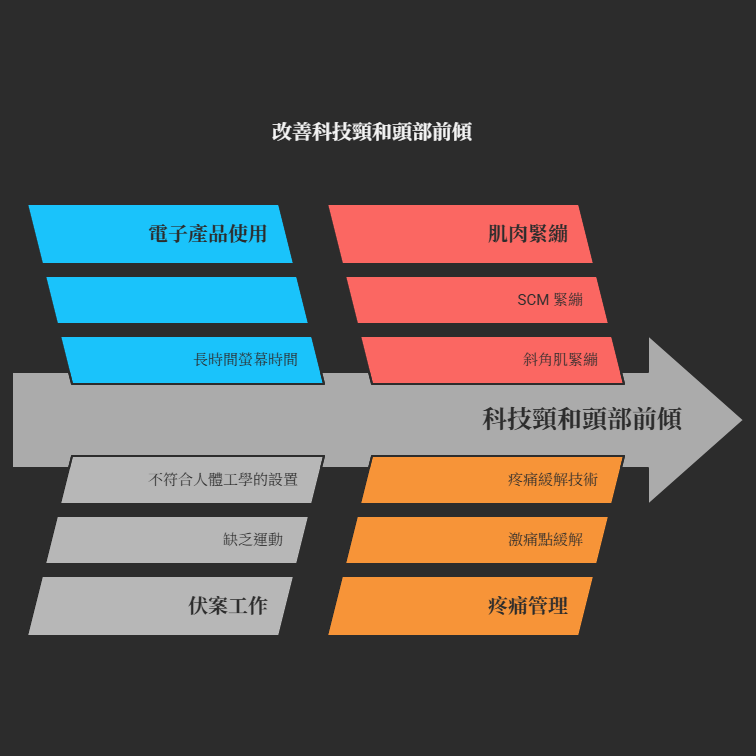 對於困擾許多現代人的「科技頸」和頭部前傾等不良姿勢,此伸展具有明確的對抗與矯正效果。透過拉長長期縮短的頸部前側肌群,有助於逐步改善因長時間使用電子產品和伏案工作導致的姿態問題。此外,SCM和斜角肌的緊繃是緊張性頭痛及肩臂放射痛的常見誘因,伸展它們有助於緩解激痛點,進而減輕這類惱人的頭痛與牽涉痛。