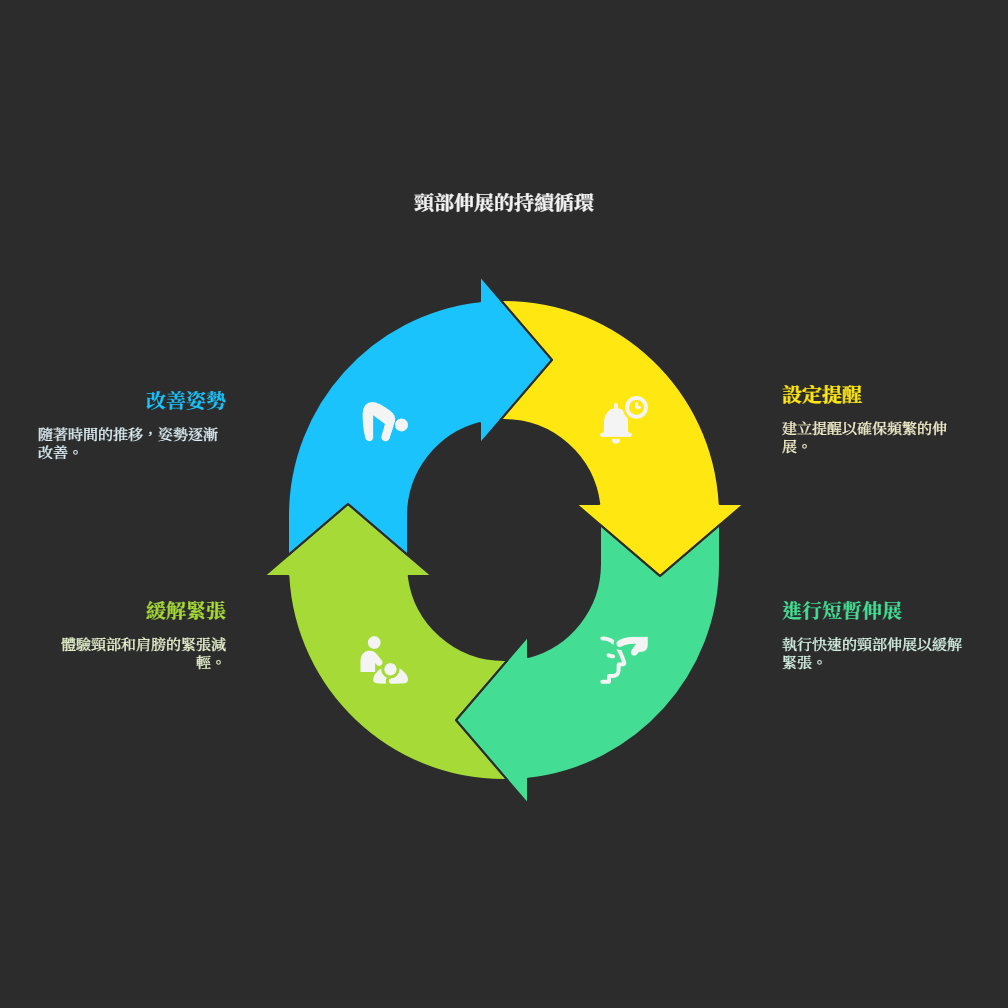 要真正從頸部伸展中獲益,關鍵在於「持之以恆」,並巧妙地將其融入日常生活。對於長時間靜態工作的辦公族群,短暫而頻繁的伸展休息,比一次長時間但偶爾為之的伸展更有效。不妨設定提醒,每小時進行1-2分鐘的伸展小休,在辦公桌前即可輕鬆完成。