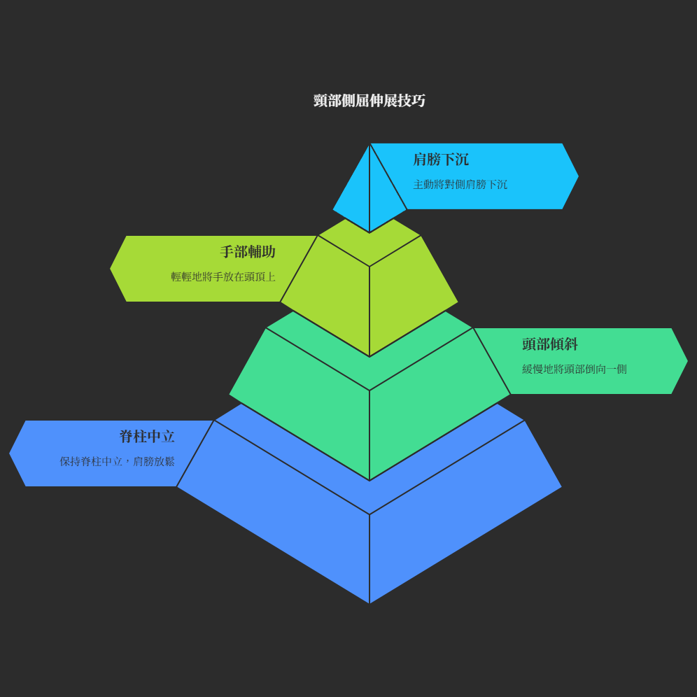 若想更精準地針對SCM,可在側屈基礎上,將頭部輕微轉向遠離傾斜側的方向(例如頭向右傾,臉稍微朝左上看),並配合輕柔的下巴微收或後仰。對於斜角肌,單純的側屈通常已很有效。此伸展的精髓在於「固定與拉長」原則:固定肩膀,拉遠頭部,才能達到最佳的伸展效果。