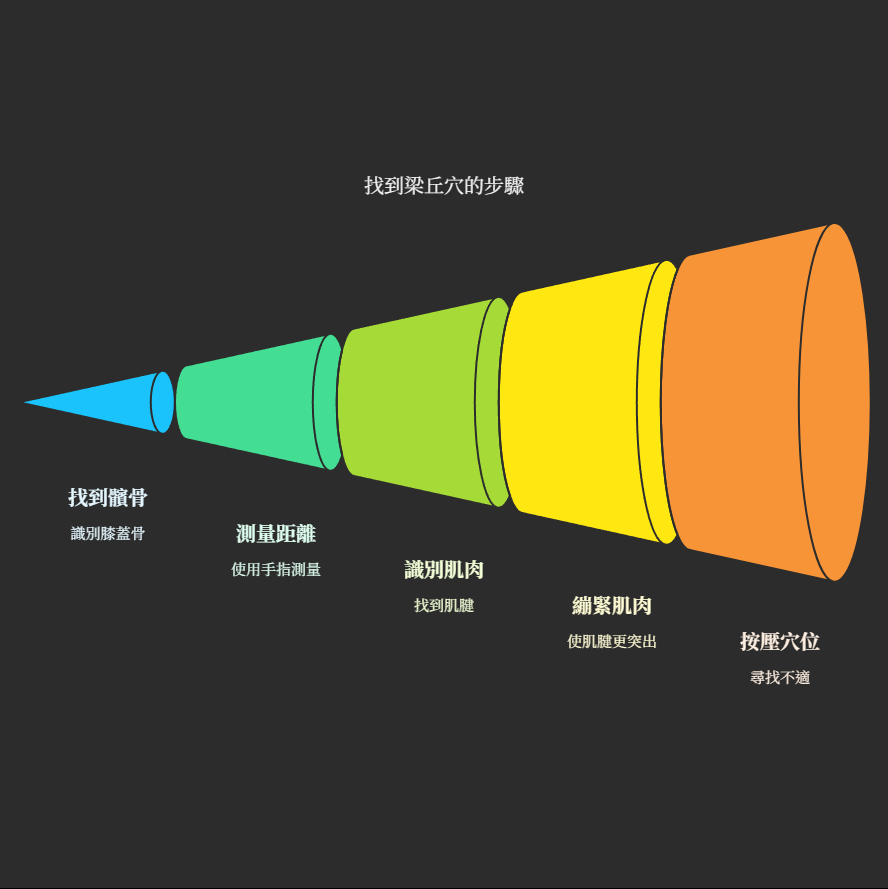 要發揮梁丘穴的全部潛力,準確找到它的位置至關重要。根據經典記載,梁丘穴位於我們大腿的前外側。當您伸直膝蓋時,先找到膝蓋骨(髕骨)的外上緣,從這個點垂直往上量約兩橫指(食指、中指併攏的寬度,這在中醫稱為「同身寸」2寸)的距離便是。更精確地說,它位於股外側肌和股直肌的肌腱之間,您通常可以在此處摸到一個小小的凹陷感。實際操作時,您可以先繃緊大腿肌肉,使肌腱更為突顯,然後用自己的手指度量,當身體有相應不適時,按壓此處常會有明顯的酸脹或痛感,這也是穴位在向我們發出訊號。