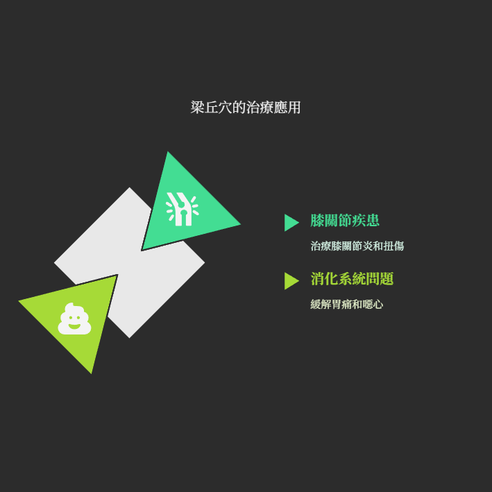 梁丘穴的應用範圍相當廣泛,涵蓋了消化系統和運動系統的多種常見病症。在運動系統方面,它是治療各類膝關節疾患的首選穴之一,例如急性膝關節炎、運動扭傷、髕骨軟化、甚至是下肢無力或輕癱。對於經常運動或需要長時間站立行走的朋友,梁丘穴是預防和緩解膝部不適的重要保健穴。在消化系統方面,梁丘穴是處理急性胃痛的特效穴,對於胃痙攣、急性胃炎等引發的突發性胃脘疼痛、胃脹、噁心等症狀,均有顯著療效。許多有胃部困擾的朋友,在突發不適時按壓此穴,常能體驗到疼痛迅速減輕的暢快感。