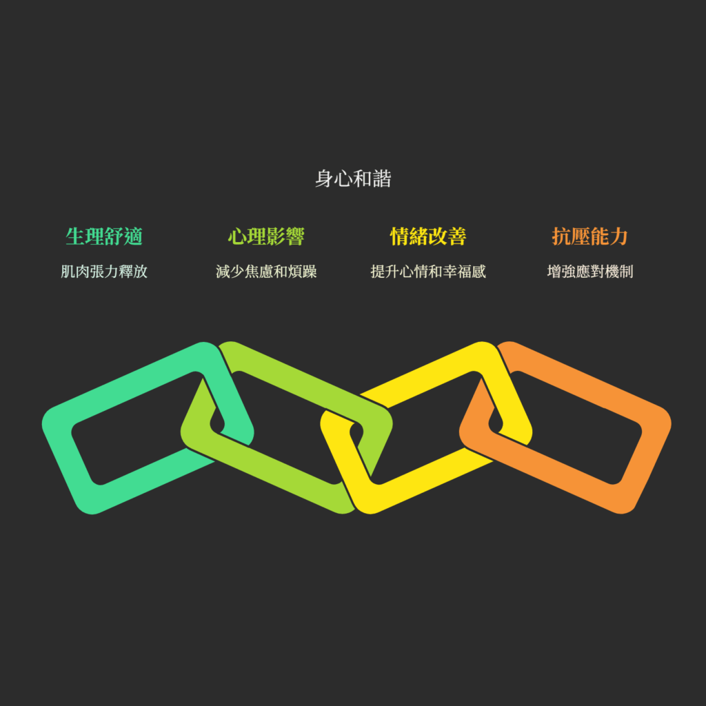 當我們成功釋放了肩頸的壓力,您會發現,獲得的遠不止生理上的舒適。肩頸的放鬆,對我們的心理狀態有著深遠的影響。緊繃的肌肉會持續向大腦傳遞「警戒」訊號,加劇焦慮與煩躁感。透過伸展與按摩,我們不僅舒緩了肌肉,也間接安撫了神經系統,有助於改善情緒,提升抗壓能力。許多朋友回饋,在肩頸得到有效放鬆後,感覺整個人都「輕盈」了起來,心情也隨之開朗。這正是「樂健生活」中身心相互影響的最佳體現。