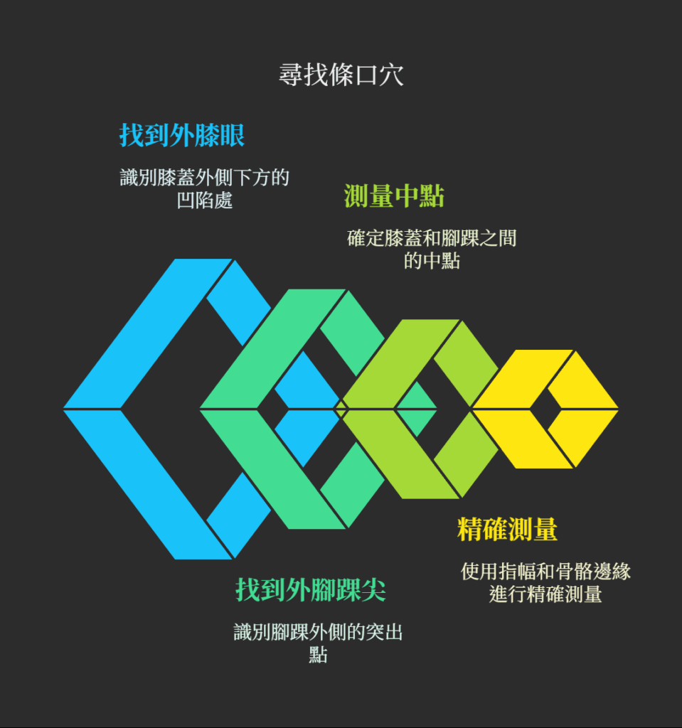 現在,讓我們一起動手找出這個神奇的穴位吧!請您舒適地坐下,輕鬆地將一隻腳放在另一側的膝蓋上。首先,找到您膝蓋外側下方的凹陷處,也就是俗稱的「外膝眼」。接著,找到您的外腳踝尖。條口穴就在這兩點連線的中點位置。還有一個更精準的方法:從外膝眼垂直往下量約四個指幅的寬度兩次(即八寸),然後從您小腿前側最突出的骨頭(脛骨)邊緣,再往外側量一個大約您中指寬度的距離。當您按壓此處時,如果您的肩膀正處於不適狀態,通常會感受到一股特別明顯的酸、麻、脹、痛感。這就對了!這股「得氣」的感覺正是身體在回應您的觸碰。