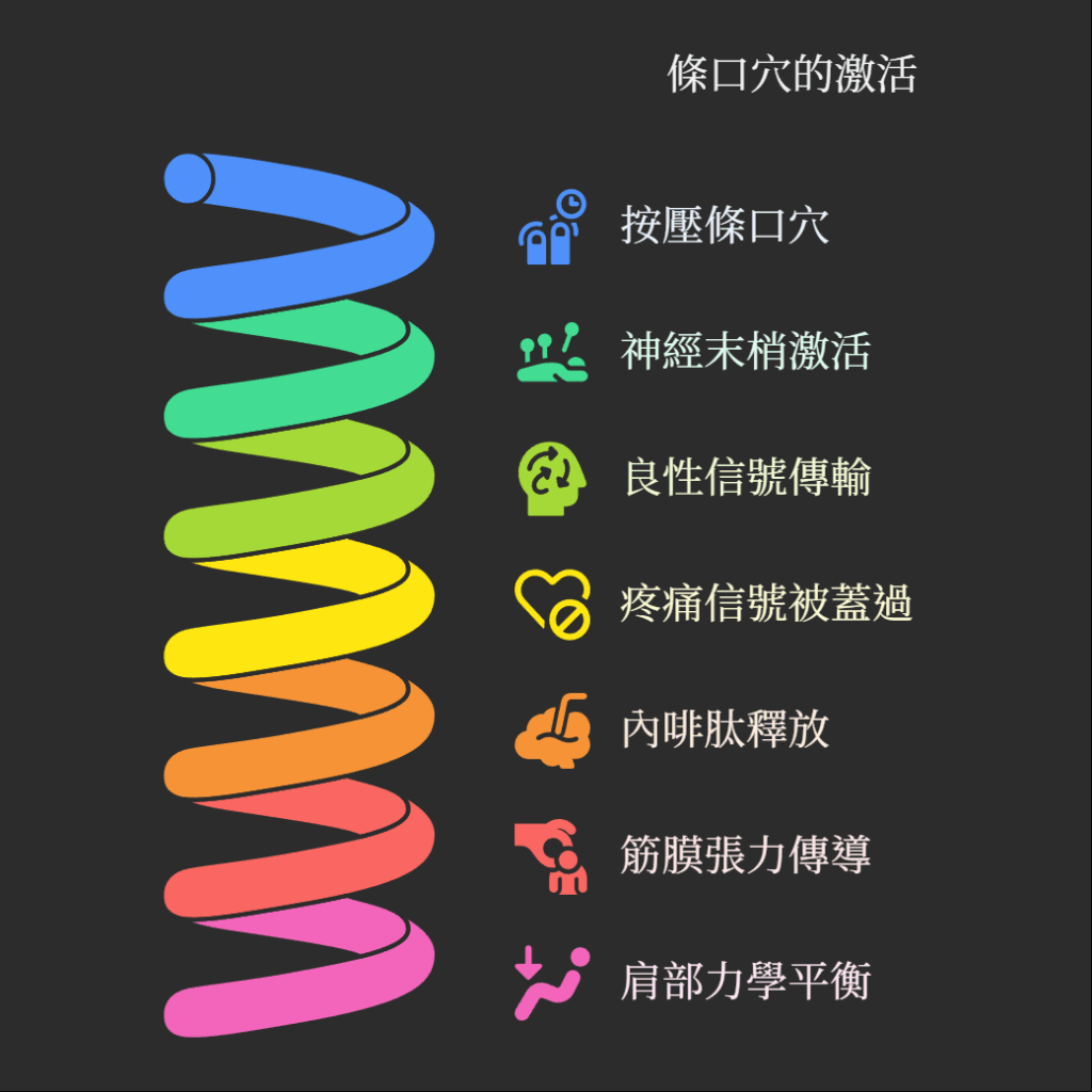 有趣的是,這個古老的智慧也得到了現代醫學的印證。當我們按壓條口穴時,皮膚下的神經末梢會被激活。從神經科學的角度來看,這會產生一股良性的感覺信號,它能比疼痛信號更快地抵達我們的大腦,從而有效地「蓋過」疼痛感,這就是所謂的「門閥控制理論」。同時,這種刺激還能促使我們的大腦釋放天然的止痛物質——內啡肽,為您帶來自然的舒緩效果。此外,從筋膜學的角度看,條口穴位於脛骨前肌之中,這塊肌肉是人體「淺前筋膜線」的一部分,刺激它可以透過整個筋膜網絡的張力傳導,間接調整遠處肩部的力學平衡。