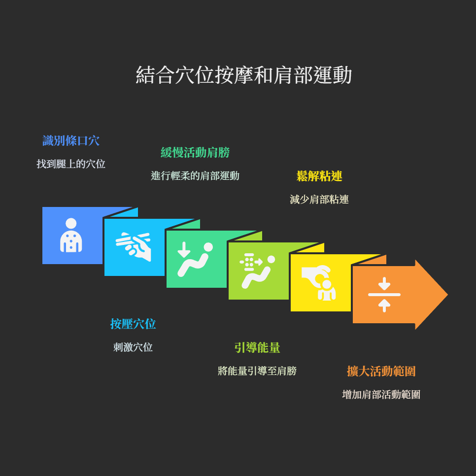 若想讓效果更上一層樓,我強烈建議您採納一個專業技巧:在按壓條口穴的同時,主動、緩慢地活動您不適的肩膀。這是一個「引氣達病所」的過程。您可以嘗試在無痛或可忍受的微痛範圍內,輕柔地進行手臂前舉、側抬、畫圈等動作。當您腿部的穴位受到刺激,同時活動肩關節時,就好像為疏通的能量指明了方向,能更精準地將氣血引導至肩部,幫助鬆解粘連、擴大活動範圍。這種「遠端按揉,局部運動」的結合,是許多專業治療師在臨床上都會運用的高效技巧。