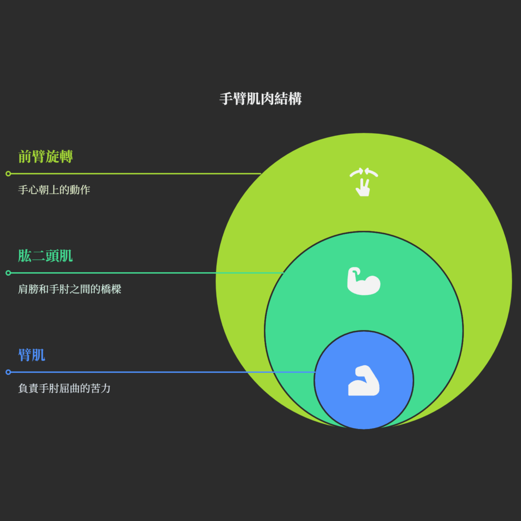 在我的按摩工作中,我會將肱二頭肌視為一座橋樑,它連接了您的肩關節與肘關節。許多人只知道它負責彎曲手臂,但它更重要的功能是「旋轉」您的前臂,做出手心朝上的動作。當您長時間打字或提重物,這個區域就會累積壓力。而在肱二頭肌深層,還有一位沉默的英雄——臂肌。它才是真正負責屈曲手肘的苦力,當它緊繃時,您會感覺到手臂前側深層的痠痛,這是我經常需要為個案處理的痛點。