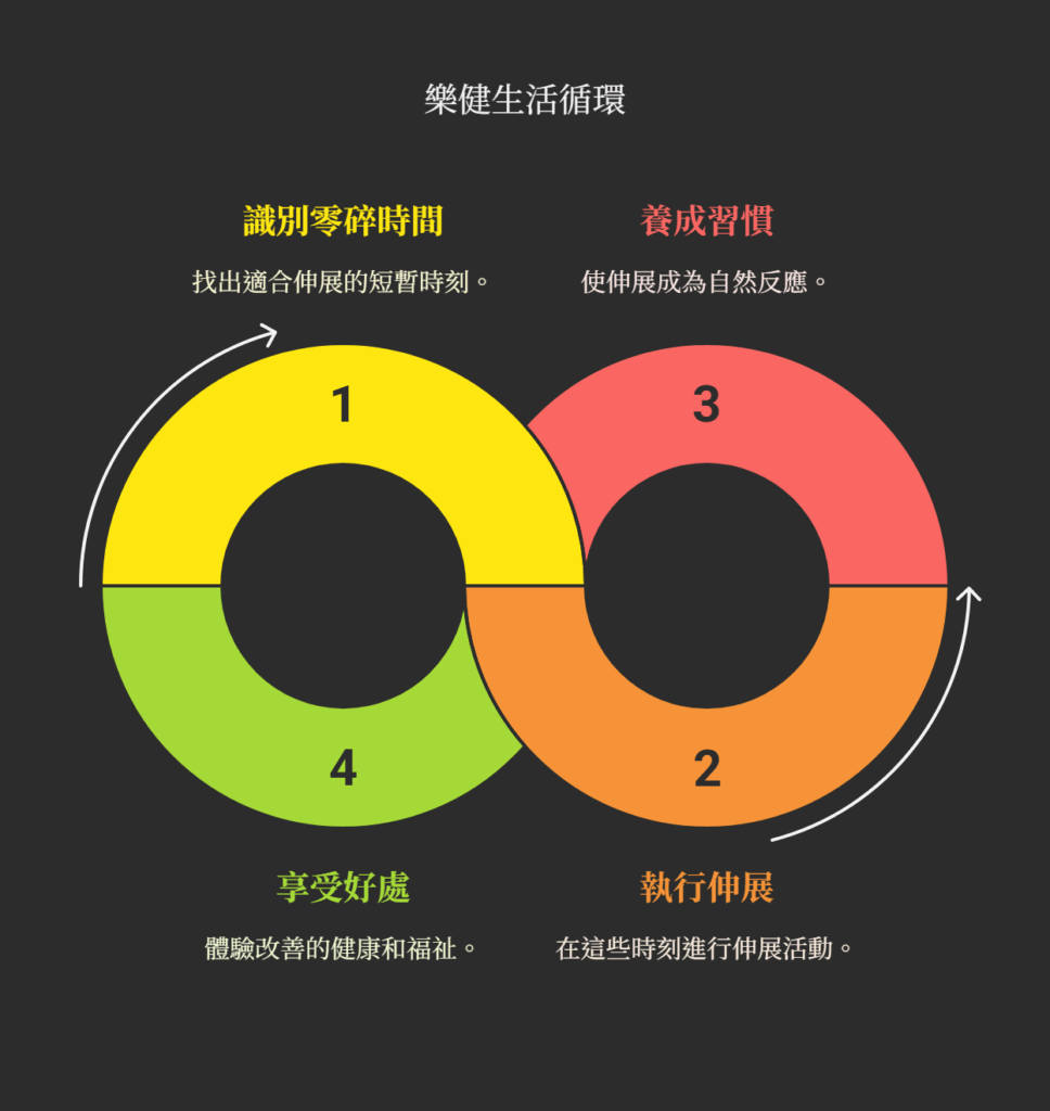 將這些伸展融入您的日常生活,並不需要您額外空出一個小時。關鍵在於利用零碎時間,創造屬於您的「微休息」片刻。例如,在結束一個視訊會議後,順手做一個門框伸展;在等待咖啡煮好的時候,做幾次手腕繞圈。將這些動作變成一種反射性的習慣,就像口渴了會喝水一樣自然。這就是我所提倡的「樂健生活」,將自我照護無縫地編織進您每日的生活節奏中。