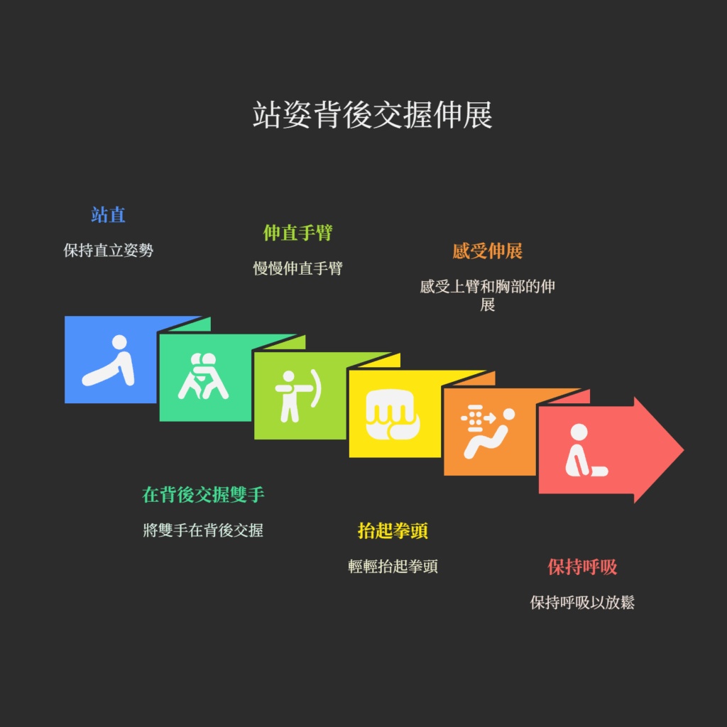 第一個我要教您的,是我常建議辦公室族群做的「站姿背後交握伸展」。這個動作非常簡單,您只需站直,雙手在背後交握。接著,慢慢地將手臂打直,並嘗試將拳頭稍微向上抬起,直到您感覺到上臂前側與胸口有溫和的伸展感。這個動作不僅能伸展肱二頭肌,更能打開因長期久坐而內縮的胸腔與肩膀,對改善圓肩姿態非常有幫助。請記得保持呼吸,感受肌肉被溫柔拉開的感覺。