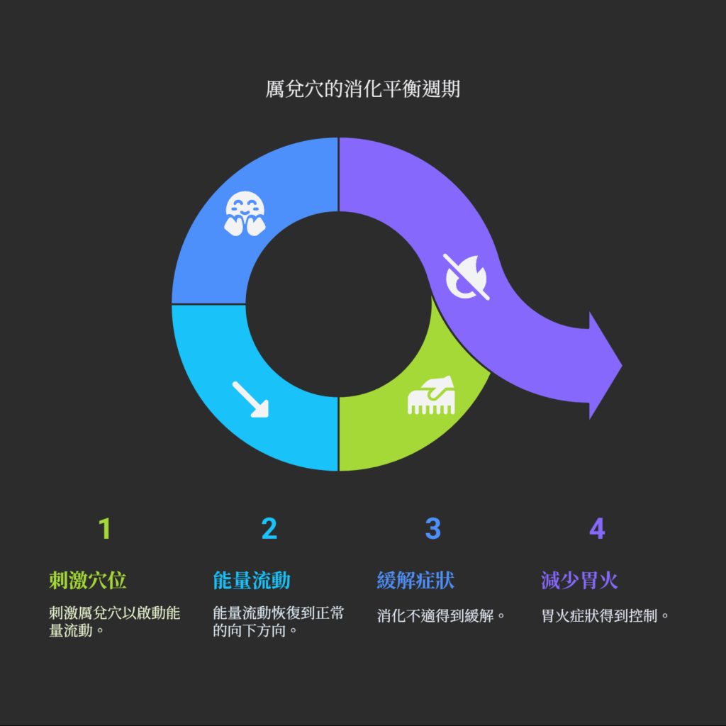 許多客戶前來求助時,主訴都是長期的消化困擾,如胃痛、噁心感或胃酸倒流。這些症狀,在中醫看來,常與「胃氣上逆」有關,也就是消化系統的能量流動方向錯了。厲兌穴最直接的功效之一,就是引導這股能量回歸正常的向下路徑。當您感到胃部不適時,刺激這一點能迅速調和消化功能。此外,對於因飲食辛辣或壓力引起的「胃火」(可以想像成消化系統過熱),如口臭、牙齦腫痛等,厲兌穴更是一個絕佳的「滅火器」,能從經絡的末端釜底抽薪,帶來清涼與舒暢。