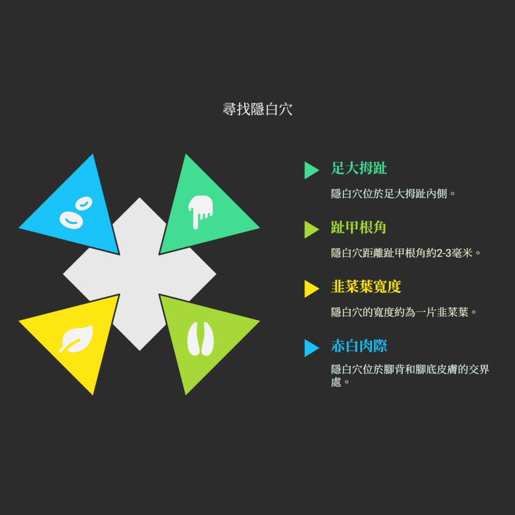 那麼,這個神奇的隱白穴究竟在哪裡呢?請您脫下鞋襪,看看您的足大拇趾。隱白穴就位於大拇趾內側,距離趾甲根角大約兩到三毫米的位置,差不多就是一片韭菜葉的寬度。一個更簡單的尋找方法是觀察您腳趾皮膚顏色的交界處,也就是腳背皮膚與腳底皮膚相接的「赤白肉際」,隱白穴就在這條線上。它的名字「隱白」本身就充滿詩意:「隱」代表著隱藏、深藏不露;「白」在中醫裡與「氣」有關。這個名字生動地描繪了脾經的經氣,如何從身體深處如秘密泉湧般流出,開啟整條經絡的序幕。