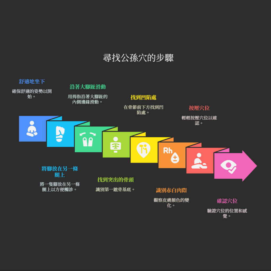 首先,讓我們來一場尋寶之旅,找出這個神奇的穴位。請您舒適地坐下,將一隻腳放到另一條腿上。用您的拇指沿著大腳趾的內側邊緣向腳跟方向滑動,您會觸摸到一個明顯突出的骨頭關節,這就是第一蹠骨基底。公孫穴就藏在這個骨節前下方的凹陷處,恰好在足弓曲線開始的地方。這個位置還有一個非常有趣的特徵,它位於足底紅潤的肉與足背較白皙的皮膚交界處。在中醫裡,這條「赤白肉際」被視為能量流動的活躍邊界。現在,試著用指腹輕輕按壓,您找到那個感覺有點痠、有點脹的位置了嗎?恭喜您,您已經找到了公孫穴。