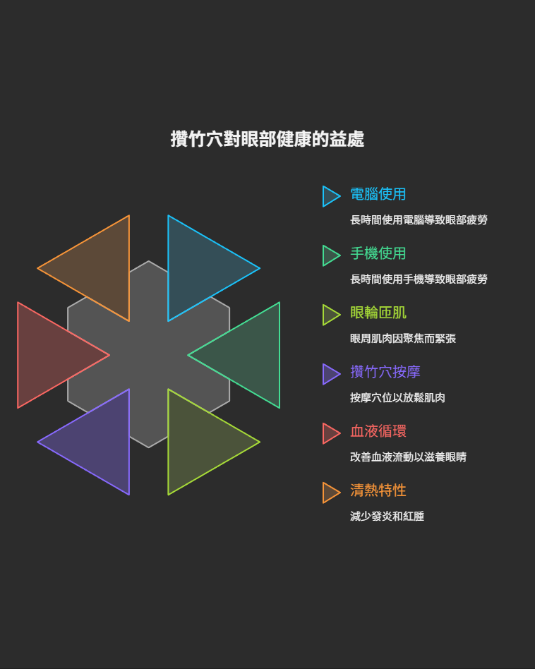 介紹數位眼疲勞的成因及其對眼睛與肩頸的影響,並提供通過穴位按摩(如睛明穴、攢竹穴、風池穴等)緩解眼部與肩頸不適的方法,強調將護眼操融入日常生活的重要性,幫助改善現代數位生活帶來的健康問題。
