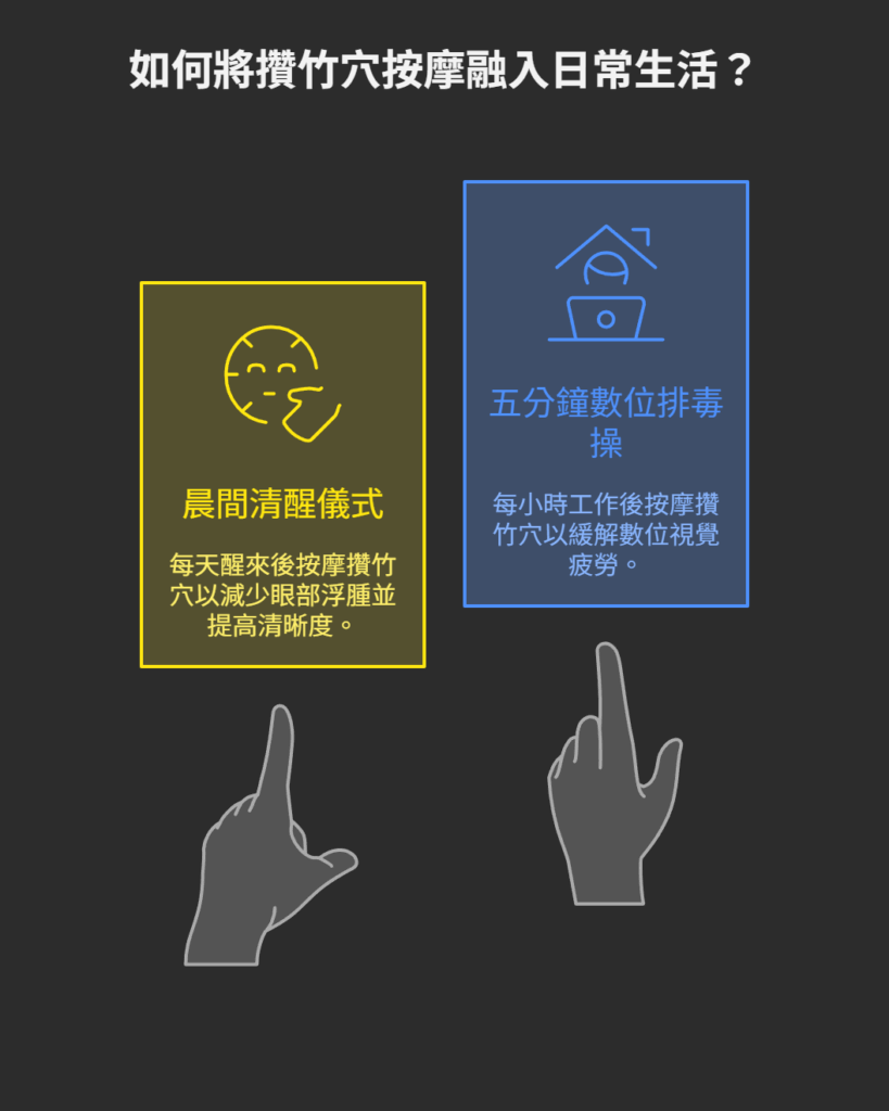 介紹數位眼疲勞的成因及其對眼睛與肩頸的影響,並提供通過穴位按摩(如睛明穴、攢竹穴、風池穴等)緩解眼部與肩頸不適的方法,強調將護眼操融入日常生活的重要性,幫助改善現代數位生活帶來的健康問題。