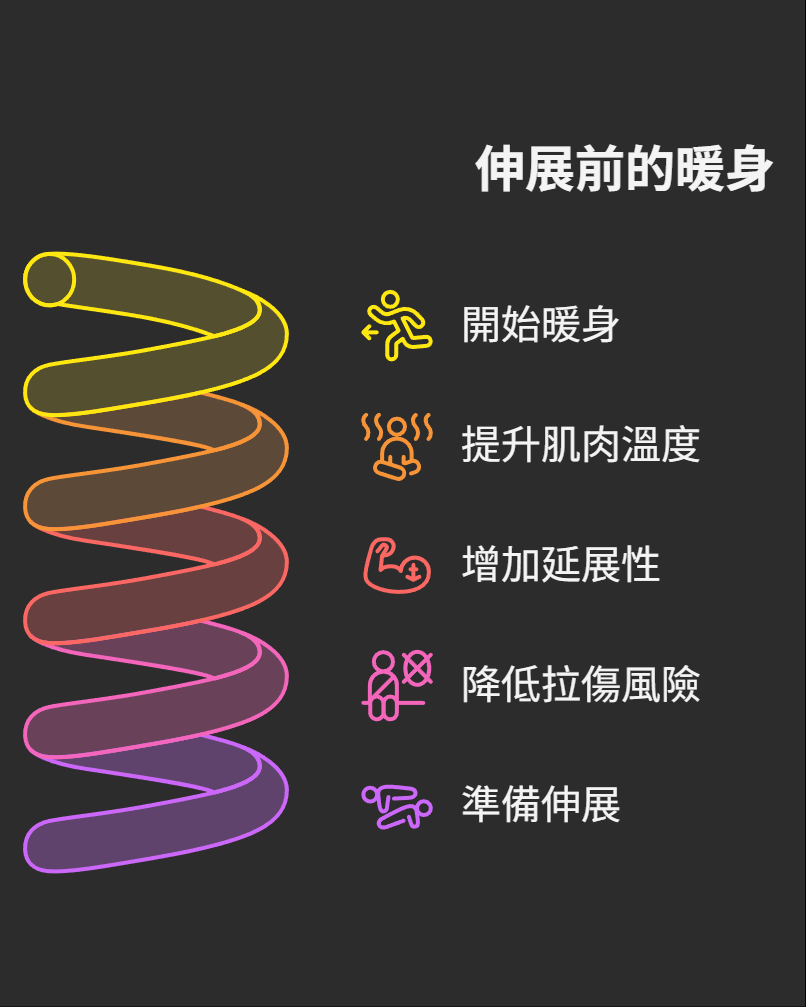 首先,「絕不在冰冷的肌肉上伸展」。請務必進行5到10分鐘的暖身,例如快走或開合跳,直到身體微微發熱。這能提升肌肉溫度,使其更具延展性,大幅降低拉傷風險。這就像在烹調前需要先預熱烤箱一樣,是不可或缺的準備工作,能確保後續的伸展更加安全且深入。