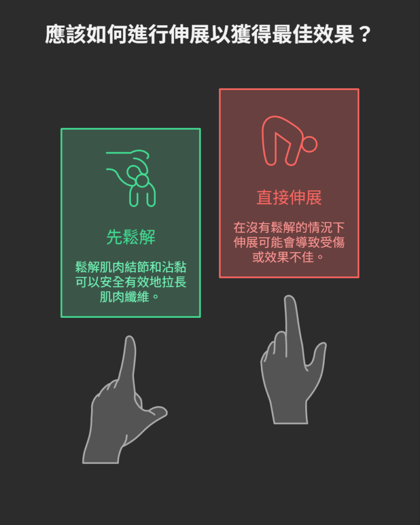 當這些沾黏與結節被解開後,您再進行伸展,才能真正安全、有效地拉長整條肌肉纖維。因此,一個更高效、更科學的順序是:「先鬆解,後伸展」。這也是為何在我的治療室裡,我總會將徒手治療與指導客戶進行特定伸展結合起來,因為這種整合性的方法,效果遠遠大於任何單一的努力。