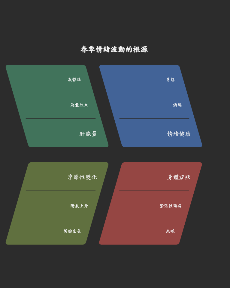 您是否注意到,春天雖然陽光明媚,但您的情緒卻更容易像雲霄飛車一樣起伏不定?這並非您的錯覺。中醫理論認為,春季的能量與我們的肝系統有著深刻的共鳴。春天是陽氣升發、萬物生長的季節,這股強勁的向上能量,會像放大鏡一樣,將我們體內本已存在的「肝氣鬱結」問題放大。被壓抑的能量在春季升發之氣的催動下,無處可去,便會在體內橫衝直撞,導致煩躁、易怒、緊張性頭痛甚至失眠等問題加劇。因此,春天既是調養肝臟、疏通氣機的黃金時期,也是最需要我們細心呵護情緒的季節。