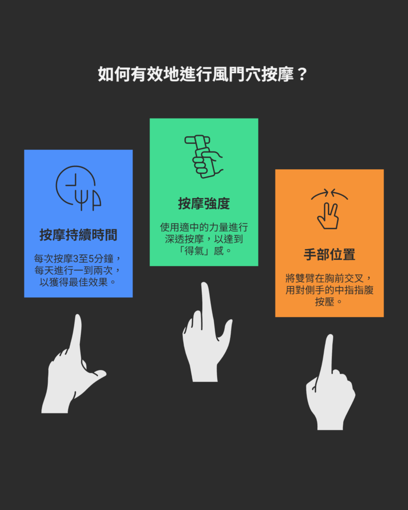 這是最簡單、最方便的自我保健法,無論您在辦公室小憩,或是在家看電視時都能輕鬆進行。您可以將雙臂在胸前交叉,用對側手的中指指腹按壓在風門穴上。請記得,力度不是越重越好,關鍵在於「深透」。以適中的力量進行持續的、環形的按揉,直到您感覺到一股向肌肉深層傳遞的酸脹感(這就是專業上說的「得氣」)。每次按摩3至5分鐘,每天進行一到兩次,就能有效地舒緩上背部的肌肉緊張,並為您的免疫系統注入活力。