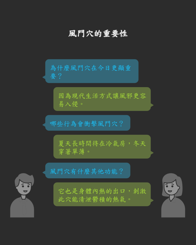 這個古老的穴位之所以在今日更顯重要,是因為我們的生活方式無形中為風邪大開了方便之門。想像一下,夏天長時間待在冷氣房,冰冷的空調風直吹後頸與上背;冬天為了美觀而穿著單薄,讓寒風有機可乘。這些行為都會直接衝擊我們的「風門」。更重要的是,風門穴不僅是外邪的入口,更是身體內熱的出口,古籍中又稱其為「熱府」。當壓力、熬夜導致身體內部「上火」時,刺激此穴能幫助我們清泄鬱積的熱氣,達到身心的平衡與舒暢。