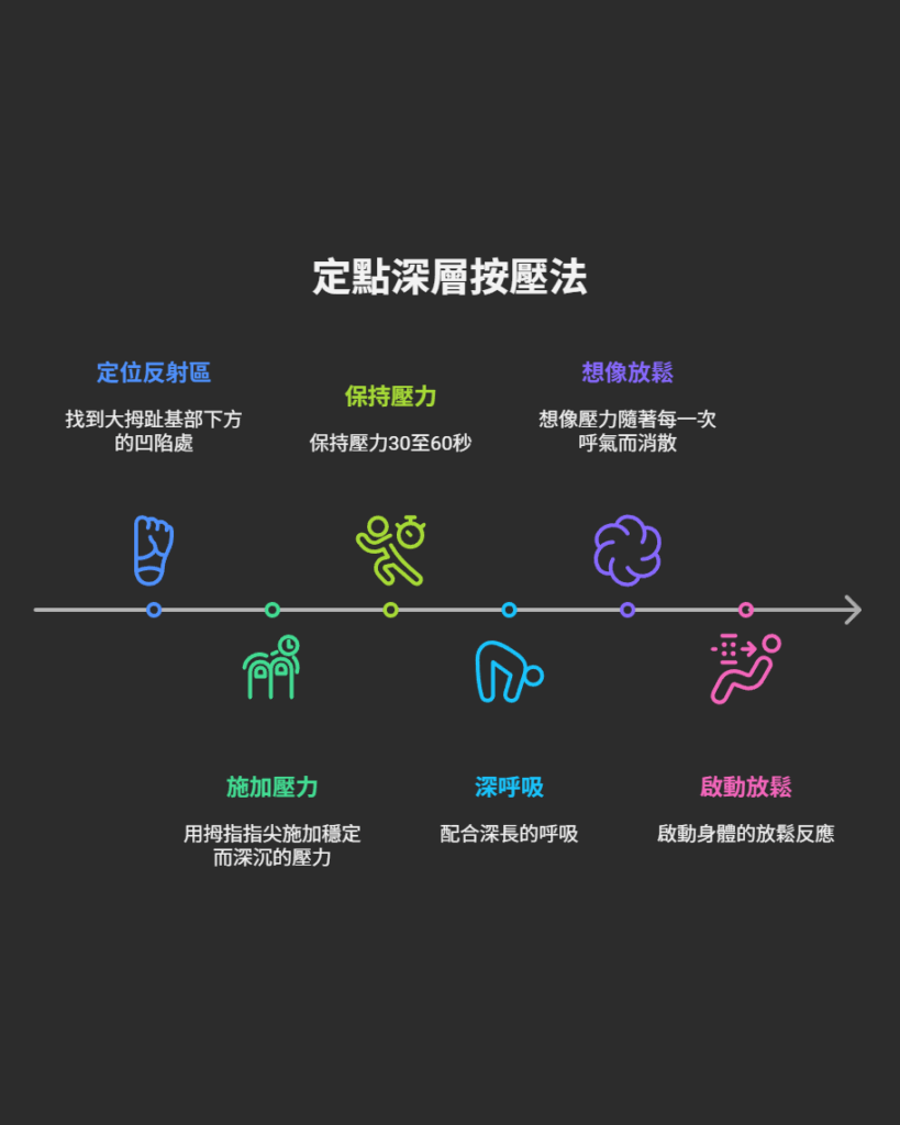 接下來是第二步,「定點深層按壓法」,這是針對核心的強力訊號。在您剛剛找到的、大拇趾基部下方的凹陷處(小腦/腦幹反射區核心),用拇指指尖施加一個穩定而深沉的壓力,保持30至60秒。關鍵在於「沉力」,這是一種專注且帶有關懷意圖的力道,感覺應是深層的酸脹感,而非尖銳的刺痛。在此期間,請配合深長的呼吸,想像壓力隨著每一次呼氣而消散。這個動作等同於直接按下了神經系統的「重設鍵」,向腦幹發送最強效的鎮靜指令,啟動身體的放鬆反應。