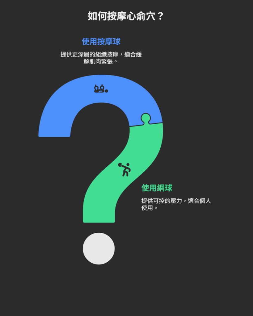 如果沒有人可以幫忙,一個網球或按摩球就是您的最佳良伴。將球放置在您背部的心俞穴與牆壁之間,透過身體前後或左右的移動,利用自身的體重來對穴位進行滾動按壓。您可以自由控制力道與位置,尋找那個「對了!」的感覺。每天花上五分鐘,在工作空檔或睡前進行這個簡單的練習,就能幫助您即時釋放一天累積下來的緊張與疲憊,是您隨手可得的健康投資。