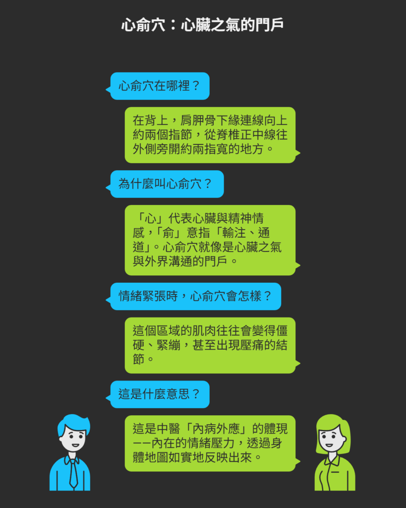 您是否曾因緊張或焦慮,而感到胸口彷彿被一塊大石壓住,呼吸不暢?這種「理氣寬胸」的感受,正是心俞穴的另一大妙用。中醫理論認為,「心主血脈」,其功能與胸中氣機的通暢息息相關。當我們透過按摩放鬆了心俞穴區域的筋膜與肌肉,不僅是緩解了背部的張力,更是間接打開了胸廓,讓呼吸變得更深、更順暢。這種從背後「解開」前胸束縛的感覺,對於緩解壓力性的胸悶和心悸有著立竿見影的效果,讓鬱結的氣機得以舒展。
