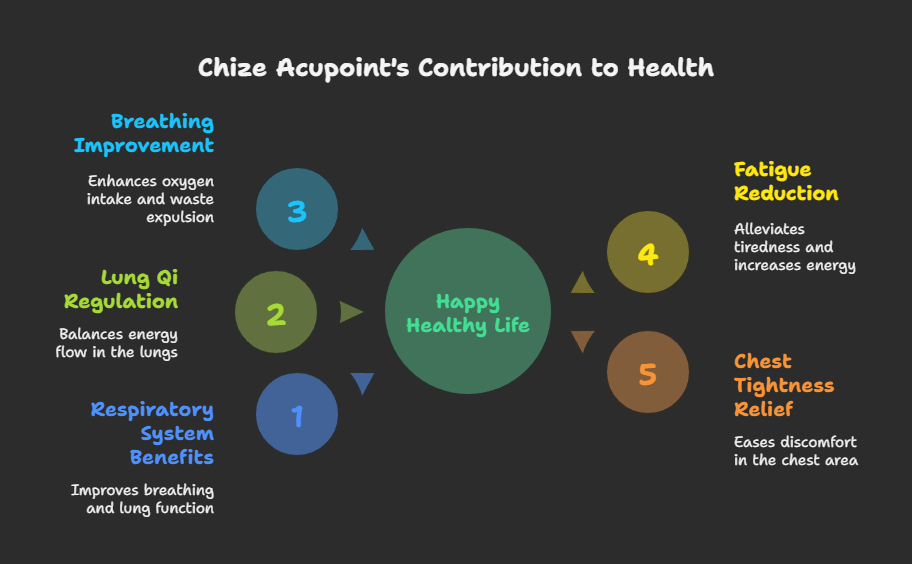 So, how exactly does this seemingly inconspicuous Chize acupoint contribute to our 'Happy Healthy Life'?Firstly, its benefits for the respiratory system are particularly significant. As a He-Sea point of the Lung Meridian, the Chize acupoint excels at regulating Lung Qi, helping us to breathe smoothly. In the fast pace and high stress of modern life, many people unconsciously develop short, shallow breathing, which affects the intake of oxygen and the expulsion of waste gases. Over time, this can easily lead to feelings of fatigue and chest tightness.By pressing and rubbing the Chize acupoint, it can help ensure the proper function of Lung Qi (its diffusing and descending action), making breathing deeper and longer – like opening a window to fresh air for the body. This is especially beneficial for people who frequently need to speak for long periods or work in poorly ventilated environments.