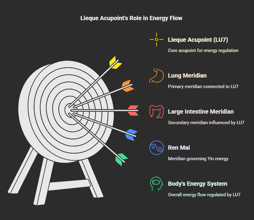So, what exactly are the marvellous aspects of the Lieque acupoint (LU7)? In Traditional Chinese Medicine (TCM) theory, it is an important acupoint on the Hand Taiyin Lung Meridian, closely connected to our respiratory system and immune defence functions.What's more special is that it is the 'Luo-connecting point' of the Lung Meridian, able to communicate with the exteriorly-interiorly related Large Intestine Meridian. This means its influence can extend to the head and face region. At the same time, it is also one of the 'Eight Confluent Points', connecting with the Ren Mai (Conception Vessel) which governs all Yin meridians of the body.You can imagine the Lieque acupoint (LU7) as an important traffic hub, connecting and regulating multiple energy channels in the body. Its name, 'Lieque,' can mean 'broken sequence' or 'crack in the heavens,' implying that, like dispelling clouds and mist, it can clear the flow of Qi, bring ease and clarity to body and mind, and repair breaks in the energy flow.