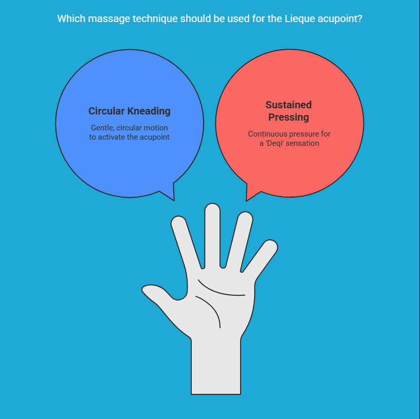Now, let's learn some specific massage techniques to better activate the potential of the Lieque acupoint (LU7). The most basic is the 'Circular Kneading Method': after locating the acupoint, apply gentle yet firm pressure with the pad of your thumb or index finger, and knead in clockwise or anti-clockwise circles.Alternatively, use the 'Sustained Pressing Method', applying continuous pressure directly onto the acupoint. The key is to use moderate pressure, aiming for a mild aching and distending 'Deqi' sensation (the arrival of Qi).Massage for 1 to 3 minutes each time. For daily health maintenance, do this once or twice a day; for acute symptoms, the frequency can be moderately increased.