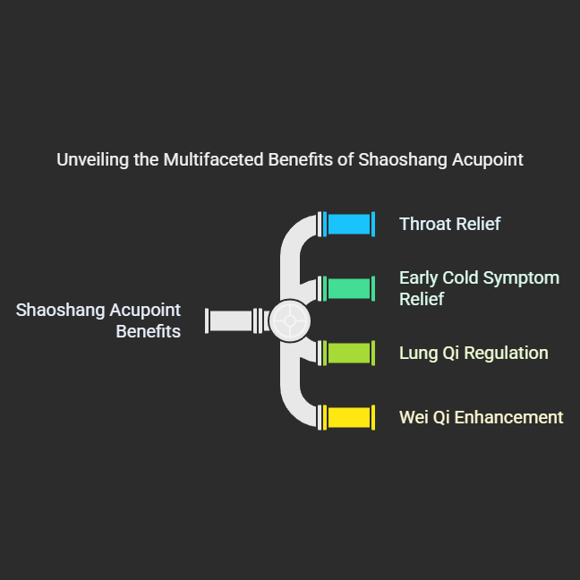 Speaking of the benefits of the Shaoshang acupoint (LU11), they are truly too numerous to count. As a Massage Therapist, I often advise clients to massage the Shaoshang acupoint when they feel a dry, itchy, swollen, or sore throat, or when early cold symptoms such as cough or fever first appear.Its effects of 'clearing the Lung and benefiting the throat, releasing the exterior and clearing heat' (Qing Fei Li Yan, Jie Biao Qing Re) are very significant, helping to relieve these discomforts as if building a line of defence for your throat.Furthermore, Traditional Chinese Medicine (TCM) believes 'the Lung governs Wei Qi (Defensive Qi),' and Wei Qi is the body's protective shield against external pathogenic factors. Regularly massaging the Shaoshang acupoint helps to regulate Lung Qi and enhance Wei Qi function, thereby boosting what we commonly call immunity. This allows you to maintain health and vitality in a changeable environment, which is crucial for pursuing a 'Happy Healthy Life'.