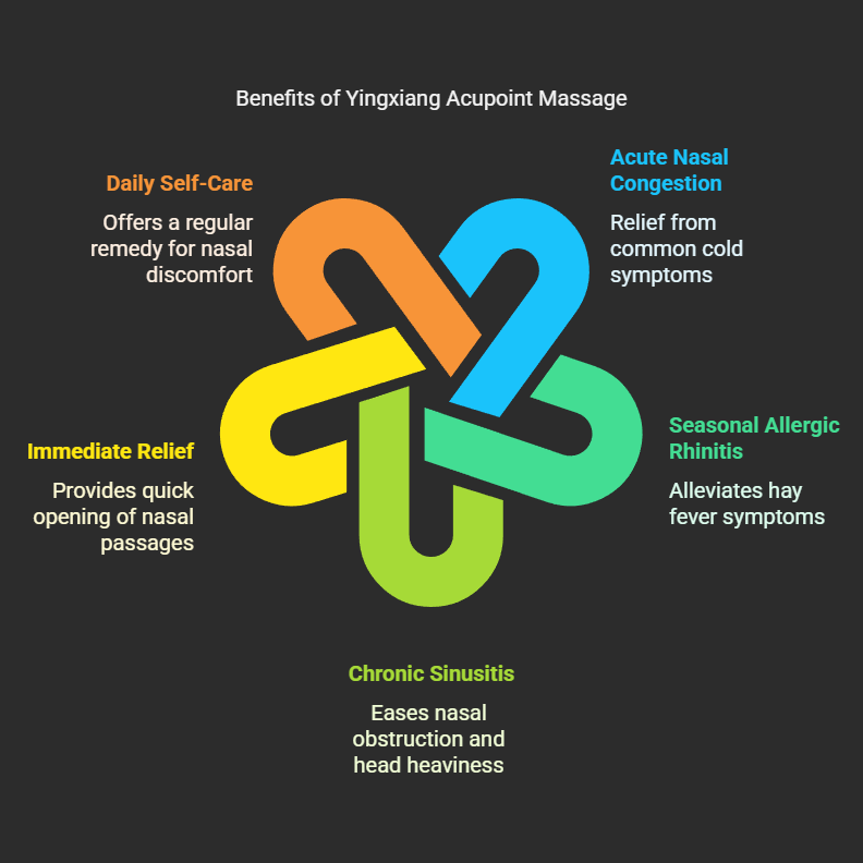 The most acclaimed effect of the Yingxiang acupoint (LI20) is its excellent ability to clear the nasal passages. Whether it's acute nasal congestion from a common cold, seasonal allergic rhinitis (hay fever – typically causing sneezing, a clear runny nose, and an itchy nose), or nasal obstruction and a heavy head associated with chronic sinusitis, massaging the Yingxiang acupoint can provide significant relief.Many people, after massaging the point correctly, can immediately feel their nasal passages open up and their breathing become easier, as if a window has been opened for a congested airway. This immediate soothing effect makes the Yingxiang acupoint an excellent daily self-care remedy for many sufferers of nasal discomfort, helping them to overcome their issues and rediscover the freedom of easy breathing.